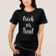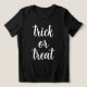 Truque Moderno ou Trate a t-shirt do Dia das Bruxas das Mulheres de Script Moderno. Este recurso de design de t-shirt é texto em letras brancas de script.