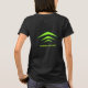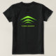 Camiseta feminina elegante com triplo bumerangue verde limão e texto "o que vai ...volta" na frente e no verso da camiseta. Tanto a imagem do bumerangue quanto o texto são coloridos na cor verde limão. Triplo sugere que nossos pensamentos, palavras e ações importam!