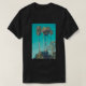 T-shirt com uma bela fotografia. Palmeiras altas com troncos longos e finos em frente a um lindo céu verde. Esquema de cor retrorativa. Relaxando e relaxando.