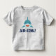 A t-shirt temática do tubarão-branco apresenta um sorridente tubarão azul com "maxilar" debaixo da letra marinho azul do estilo dos quadrinhos.