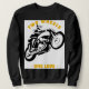 High-contrast black motorcycle silhouette with warm yellow arch text 'TWO WHEELS' and 'ONE LOVE' at the bottom; bold, retro-inspired graphic ideal for biker apparel and streetwear.