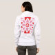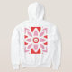 O design apresenta um padrão simétrico com uma combinação de cores vermelha e branca. No centro, há um design floral estilizado com camadas de pétalas radiando para fora. Ao redor deste motivo central estão elementos giratórios e formas decorativas adicionais, criando um aspecto equilibrado e harmonioso. O uso de apenas duas cores faz o intrincado design se destacar maravilhosamente.