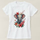 Um toque de verão: O bebê elefante num mar de flores . Essa design encantadora apresenta uma ilustração amorosa de um pequeno elefante bebê, pintado em delicadas sombras de cinza. Suas orelhas cor-de-rosa acrescentam um toque divertido e encantador. Seus olhos grandes e expressivos irradiam curiosidade e amizade, enquanto sua doce expressão facial transmite puro calor. O elefante se encaixa gentilmente entre uma variedade de flores coloridas em tons vibrantes de vermelho, laranja, rosa e branco.