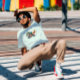 Uma raposa andando de bicicleta BMX, fazendo um truque de ar de médio. A raposa determinou a expressão e vestiu um capacete e óculos.
