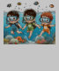 A cheerful illustration of three kids snorkeling underwater, exploring a vibrant coral reef filled with colorful fish, coral, and a friendly octopus. The children wear goggles, snorkels, and matching swimsuits in blue, green, and orange, capturing the excitement of discovery and friendship beneath the sea.