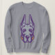 Este design é um close-up da Universidade em Albany Great Dane mascot head. A ilustração usa contornos roxos ousados com sombreamento detalhado em cinzas para a face do Grande Dane, destacando suas características angulares. Os olhos são afiados, e a expressão transmite alerta e força. Acentos de ouro aparecem em ambos os lados da mandíbula do cão, acrescentando um toque de calor à aparência feroz do outro jeito. Os ouvidos estão erguidos e pontiagudos, reforçando o sentido de prontidão e autoridade do logotipo. O design é mínimo, mas poderoso, ideal para a identidade atlética da UAlbany.
