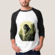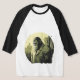 A design de camiseta retrata um gorila vestida como um humano contra o pano de fundo de uma cidade. O trabalho de arte é executado em um estilo de quadrinhos muito minimalista e tem duas cores. O gorila é mostrado vestindo camisa e calças, e a paisagem urbana no fundo é estilizada com formas e linhas simples.