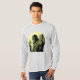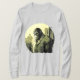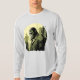 A design de camiseta retrata um gorila vestida como um humano contra o pano de fundo de uma cidade. O trabalho de arte é executado em um estilo de quadrinhos muito minimalista e tem duas cores. O gorila é mostrado vestindo camisa e calças, e a paisagem urbana no fundo é estilizada com formas e linhas simples.