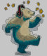 Um urso vestindo fones de ouvido dança alegremente com notas musicais coloridas ao seu redor.