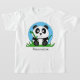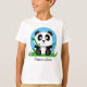 Um adorável urso panda preto e branco sentado sobre uma grama verde fresca e segurando uma bengala verde de bambu. Abaixo está uma modelo para adicionar seu próprio nome, mensagem ou exclusão para deixar o vazio.