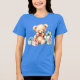 T-shirt com uma bela ilustração, com um ursinho de pelúcia do estilo vitoriano. Vestindo um arco vermelho rico. Desenhado em um estilo vintage bonito e antigo. Presentes de Natal pastel vermelho e azul rodeados por este urso de coração quente.