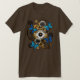 Composição do relógio de aço redondo com discagem numérica romana preta, decorado com engrenagens de ouro e latão, borboletas morfo azuis e lentes danificadas sobre fundo listrado castanho. Estilo Steampunk.