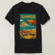 A retro summer design featuring palm trees, ocean waves, and a warm sunset with birds in the sky.