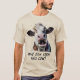 Uma camiseta unisex de cor clara com uma vaca de cor d'água e uma citação personalizada. Escolha uma base inferior branca para evitar que a cor da t-shirt apareça através do impressão, a menos que seja escolhida uma t-shirt branca. Personalize esta modelo com sua citação.