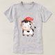 Uma t-shirt com uma imagem adorável de uma vaca crua e branca, vestindo um chapéu vermelho.