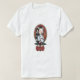 a cartoonstyle vampire with a serene expression wearing a gray shirt with a cat emblem framed by flames and a decorative border