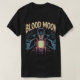 : Uma ilustração digital de alto contraste impressionante com uma figura vampira com olhos vermelhos brilhantes e presas afiadas, segurando uma órbita luminosa. O fundo retrata uma cena de cemitério assustadora com árvores negras e lápides debaixo de um céu escuro, com as palavras "LUA SANGUÍNEO" destacadas acima da figura. O trabalho de arte usa uma paleta de cores limitadas de blues, roxas e vermelhos contra um fundo preto, criando uma atmosfera dramática e sombria.