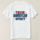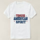 A design de t-shirt apresenta a frase "True American Spirit" em letras negrito, gráficas com um esquema de cores multicolorido. As cores utilizadas são vermelho, branco e azul, que são as cores da bandeira americana. A design é simples e atenta aos olhos, e é certo que faz uma declaração.