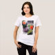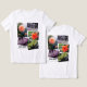O design nesta camiseta é um grupo de fotografias originais de flores laranja, flores lavandas e folhas tropicais. As cores vão de pastéis macios a brilhantes, com uma variedade de verdes em sombra e luz brilhante. Na camiseta diz "VIVENDO VERDE com laranja e lavanda" em um canto da design.