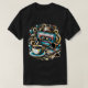 Um design de camiseta retrô com uma ilustração detalhada de uma fita cassete antiga com cores vibrantes e nostálgicas, evocando a era musical clássica dos anos 80 e 90.
