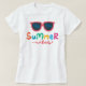 O verão vibe com óculos escuros, camiseta de design para mulheres, que é perfeita para ajudá-la a entrar naquele modo de férias bonito. Este design colorido apresenta letras de cores vibrantes e uma ilustração de óculos e vibrações solares na caligrafia na moda.