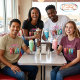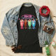 Sip straight into 1950s nostalgia with this super-fun retro diner t-shirt. Four classic milkshakes in juicy strawberry pink, rich chocolate brown, cool mint green, and dreamy blue sit proudly under a glowing pink neon “DINER” sign with sparkling stars. Each shake is piled high with whipped cream, bright cherries, and striped straws – pure soda-fountain magic!