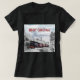 Camiseta com fotografia de uma paisagem de inverno nevada com pinheiros cobertos de neve. Um trem vermelho, dourado e preto à moda antiga, viajando pela natureza selvagem. Conjuga os pensamentos de voltar para casa no Natal. O texto editável diz: Feliz Natal.