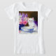 T-Shirt com um lindo gatinho branco vestindo uma fita roxa! Este gatinho fluffy se posiciona próximo a uma tigela azul e um vaso de flores rosa, roxas e brancas. Um presente maravilhoso para amantes de gatos e entusiastas de arte vitorianos!
