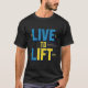 A camiseta "Live to Lift" apresenta um design ousado e poderoso com uma fonte gráfica forte. O texto aparece de forma destacada no peito, acompanhado de um ícone da campainha minimalista, simbolizando força e dedicação. A design é ideal para entusiastas malhações e apaixonados pela elevação.