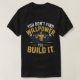 Esta camiseta preta apresenta o texto motivacional "VOCÊ NÃO ENCONTRA WILLPOWER, VOCÊ A CONSTRUI" organizado em torno de um gráfico central. A palavra "WILLPOWER" é grande e em uma fonte amarela em negrito com um contorno escuro. O gráfico mostra um indivíduo muscular, que parece ser um homem de pele clara, segurando uma campainha em seus ombros, sugerindo um exercício de squat. O fundo tem uma design azul e cinza.