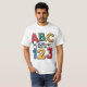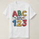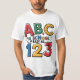 Design de camiseta vibrante e lúdica, com letras e números grandes e coloridos (A, B, C, 1, 2, 3) dispostos em um padrão balístico. A frase divertida "Voltar à escola é fácil, já que 123" é integrada ao design, fazer que esta camiseta é perfeita para jovens estudantes, professores e pais que procuram celebrar o início do ano escolar com um estilo animado e educativo