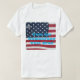 Uma camiseta que diz Vote em Democracia, Vote Blue. O padrão da bandeira americana está ao fundo.