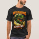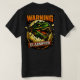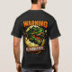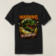 A vibrant graphic design featuring a Tyrannosaurus Rex emerging from a cracked egg. The dinosaur's vividly detailed face is positioned prominently, showcasing sharp teeth and intricate scales. The color palette blends greens and blacks with splashes of orange, creating a striking contrast against the yellowish eggshell. The background is minimal, allowing the main subject to stand out. Text elements, including 'WARNING' and 'CLASSIFIED', are incorporated in bold fonts, adding a dramatic effect. Light sources appear to highlight the dinosaur’s features, enhancing its fierce expression. The composition is dynamic, suggesting movement and energy as if the creature is breaking free from confinement.