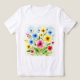 The illustration features blue, yellow, pink, and red flowers with green leaves.