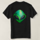 Cool fun T-Shirt with a printed image of 3/three green alien heads on a very dark blue background, with a caption/phrase which reads "WE ARE HERE"