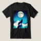 Tee numa silhueta negra de um lobo, uivando em uma grande lua cheia, parado em um pico de montanha com gelo coberto de montanhas ao fundo