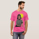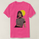 Camiseta com a arte digital de uma mulher com cabelo curto e roupa listrada, atrás dela tem um sol fazendo.