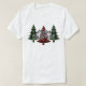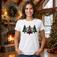 Esta camiseta apresenta uma árvore de Natal vermelha e duas xadrezes de búfalos verdes com um festivo "Feliz Natal" em roteiro decorativo colocado à sua frente.