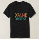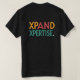 O design de t-shirt apresenta a frase "Xpand Xpernity" em letras negrito, multicores. O texto é colocado sobre um pano de fundo de formas geométricas intrincadas e simétricas, criando uma estética visualmente impressionante e moderna. O design transmite uma sensação de crescimento, conhecimento e expertise.