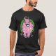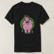Ein schwarzes T-Shirt mit einem rosa Cartoon Monster auf einem grünen Kreis. Eine fröhliche Figur, die gute Laune verbreitet.