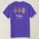 T-shirt com uma ilustração de três guloseimas de sorvete diferentes. Um picolé azul-esverdeado com gotas de morango e salpicadores coloridos. Um picolé de melancia. Um cone com camadas deliciosas de sorvete em rosa e menta. Todos com sorrisos kawaii fofos.