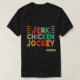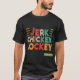 A t-shirt apresenta "Jerk Chicken Jockey" num design ousado e multicolorido. Cada palavra poderia ser de uma cor diferente, ou as próprias letras poderiam ser um gradiente de vermelhos picantes, amarelos e laranjas. Imagine chamas lambendo as letras "Jerk" para sugerir o calor do prato, enquanto "Chicken" é um legal verde ou azul. "Jockey" pode ser uma fonte divertida, talvez reminiscente de sedas de jóquei.
