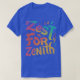 Um design de camiseta vibrante com o texto "Zest for Zenith" em uma fonte divertida e multicolorida, que lembra um pôr do sol. O design é arrojado e atraente para os olhos, com as cores em transição suave de laranja para amarelo para rosa. O texto está centrado no peito da camisa, com um pequeno gráfico colorido de uma explosão solar abaixo dela. O design é perfeito para quem ama viver a vida ao máximo