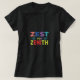 A camiseta apresenta um design vibrante e multicolorido com o texto "Zest for Zenith." O uso enérgico de múltiplas cores reflete o entusiasmo de lutar pelo pico.