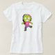 Ótima ilustração de um zumbi verde caminhando em frente com braços erguidos. Parte do cérebro da zumbi é visível e ela tem uma expressão assustadora no rosto. A zumbi tem cabelos pretos longos e ela está vestindo calças azuis e uma camisa cor-de-rosa com uma foto do crânio.