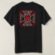 Nosso crânio assustador da cabeça da chama, uma cruz maltesa e as formas gráficas do tatuagem são combinados neste design gráfico assustador e incomum. Há uma cabeça flamejante do crânio do divertimento no ombro direito traseiro.