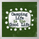 Uma peça tipográfica divertida, acampada, com as palavras "Camping Life Is The Good Life" . É verde e branco com texto preto e verde e pontos brancos brancos ao redor da frase.