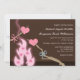 Convites de casamento bonito e bonitos para campismo com dois corações em galhos guardados sobre uma fogueira cor-de-rosa brilhando, sobre um fundo castanho, e seus detalhes de casamento impressos em uma fonte branca.