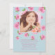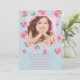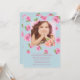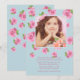 Rosas rosa adoráveis são compostas por bolinhas brancas minúsculas e colocadas sobre um fundo azul claro. Uma janela de fotos quadradas contém sua foto favorita. Adequado para todas as idades.O cartão é fácil de personalizar com seu texto, fonte, cor da fonte e escolha de seis tipos de papel.
