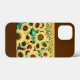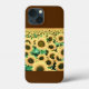 Capa de telefone num campo de girassóis ouros amarelos com centros castanhos de chocolate e folhas verdes